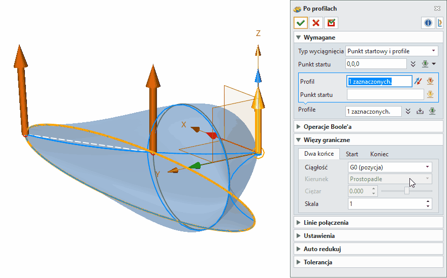 Profile – do loftowania można wskazać szkice, krzywe lub krawędzie. Profile można dodawać, modyfikować i usuwać.
