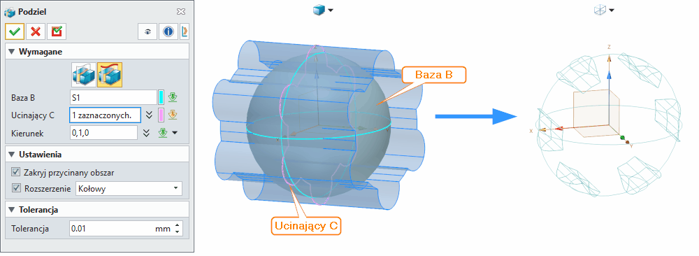 Podziel bryły (Divide Shapes) Komenda służy do dzielenia brył lub otwartych kształtów w miejscach przecięcia z ścianami, innymi bryłami lub płaszczyznami odniesienia. W wyniku działania otrzymujemy dwie odrębne bryły lub kształty. Funkcja może także podzielić otwarty kształt lub utworzyć jeden lub więcej otwartych kształtów. Komenda ta jest podobna do funkcji Podziel ściany według ścian (Split Faces with Faces), jednak nie zachowuje połączenia pomiędzy dwoma powstałymi kształtami. Podziel bryły znajduje szerokie zastosowanie w projektowaniu form wtryskowych, gdzie umożliwia szybki podział modelu na stempel i matrycę, nawet jeśli bryła zawiera otwory lub nieciągłości powierzchni. Dzięki hybrydowemu modelowaniu bryłowo-powierzchniowemu w ZW3D większość poleceń może działać płynnie zarówno na bryłach, jak i powierzchniach, co znacznie upraszcza proces projektowania. W programowaniu CAM komenda pozwala narzędziu automatycznie omijać dziury i nieciągłości podczas obróbki części, oszczędzając projektantom ogromną ilość czasu. Metody działania komendy Przez powierzchnię (Surface) - W tej metodzie używamy wyłącznie powierzchni jako geometrii dzielącej. Można wybrać pojedynczą ścianę, powierzchnię lub płaszczyznę odniesienia, która będzie służyć jako narzędzie tnące. Jest to podstawowy tryb działania komendy, stosowany gdy posiadamy już gotową geometrię dzielącą, która przecina bryłę bazową w żądanym miejscu. Przez wytłaczaną bazę (Extrude Base) - Ta metoda umożliwia użycie zarówno brył, jak i powierzchni jako geometrii dzielącej. Dodatkowo oferuje możliwość wyboru szkicu, który zostanie automatycznie wyciągnięty w kierunku określonym przez użytkownika. W tym trybie szkic służy jako profil przekroju, który system wytłacza wzdłuż wybranego wektora kierunku, tworząc tym samym dynamiczną geometrię dzielącą. Metoda ta jest szczególnie użyteczna, gdy nie posiadamy jeszcze gotowej powierzchni dzielącej i chcemy ją utworzyć bezpośrednio podczas wykonywania operacji podziału. Wymagane dane wejściowe komendy Baza B (Base) - Wybierz bazową bryłę lub kształty do podzielenia. Może to być zarówno zamknięta bryła, jak i otwarty kształt powierzchniowy. Ucinający C (Cutting C) - Wybierz dzielące kształty i/lub płaszczyzny odniesienia, które będą służyć jako geometria tnąca. Kierunek (Direction) - Wymagany parametr dostępny tylko w metodzie Przez wytłaczaną bazę. Określa kierunek wyciągnięcia wybranego szkicu, który stanie się geometrią dzielącą. Użytkownik może wskazać oś, krawędź lub wektor definiujący kierunek wytłoczenia profilu tnącego. Opcjonalne dane wejściowe komendy Dysponowanie ucinającym C (Cutter C) - Określa sposób postępowania z dzielącymi kształtami i/lub płaszczyznami odniesienia po wykonaniu operacji. Dostępne opcje: Zachowaj (Keep) - Zachowuje dzielący kształt bez zmian. Usuń (Delete) - Usuwa dzielący kształt po wykonaniu operacji. Podziel (Divide) - Dzieli również sam kształt dzielący. Zamknij przycięty obszar (Cap trimmed region) - Za pomocą tej opcji można zdecydować, czy dwa powstałe kształty będą zamknięte na przyciętych krawędziach (tj. dwie niezależnie zamknięte bryły), czy otwarte (tj. dwa niezależnie otwarte kształty). Jeśli opcja jest zaznaczona, powierzchnie zamykające zostaną odziedziczone z geometrii dzielącej (tj. ścian, kształtów lub płaszczyzny odniesienia). Rozszerz ucinające ściany (Extend cutting faces) - Geometria dzieląca MUSI wykraczać poza geometrię bazową. Jeśli nie wykracza, użyj tej opcji, aby ją rozszerzyć. Ta opcja ma zastosowanie tylko wtedy, gdy jako geometria dzieląca używane są powierzchnie. Liniowe (Linear) - Rozszerzenie przebiega wzdłuż ścieżki liniowej. Jest to przydatne, ponieważ zachowuje przedłużenie od końca w kierunku stycznej, ale nie pasuje do krzywizny, co powoduje między innymi wizualną nieciągłość. Kołowe (Circular) - Rozszerzenie przebiega wzdłuż ścieżki kołowej w kierunku krzywizny. Jest to przydatne, ponieważ pasuje do istniejącej krzywizny, ale jeśli rozszerzysz zbyt daleko, zgnie się z powrotem w kierunku przeciwnym do kierunku stycznej. Tolerancja (Tolerance) - Ustaw tolerancję lokalną, która jest ważna tylko dla bieżącej komendy. Po zakończeniu komendy będzie używana globalna tolerancja w modelowaniu.